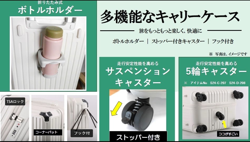 Mサイズのボトルホルダー・ストッパー付きキャリーケース、S24-C-207が新しく登場!このアイテムは、ボトルホルダーが付いているため、水分補給を手軽に行うことができ、旅のお供に最適です。また、ストッパー付きのキャスターにより、移動時の安定感も抜群!日常の移動やちょっとした旅行にも合わせやすいデザインです。